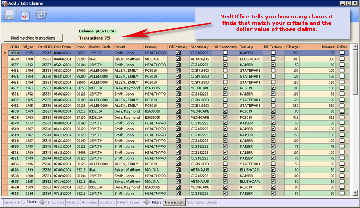 After filtering, MedOffice automatically finds all outstanding claims that match your criteria.